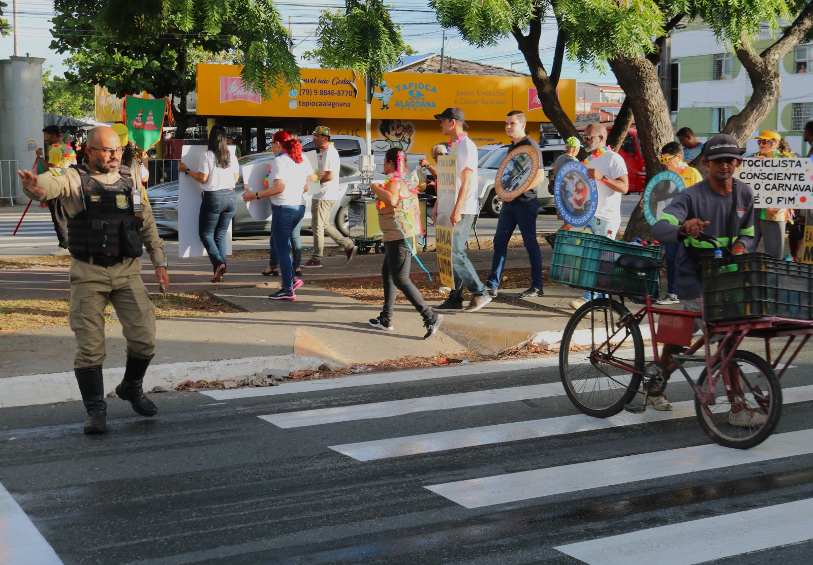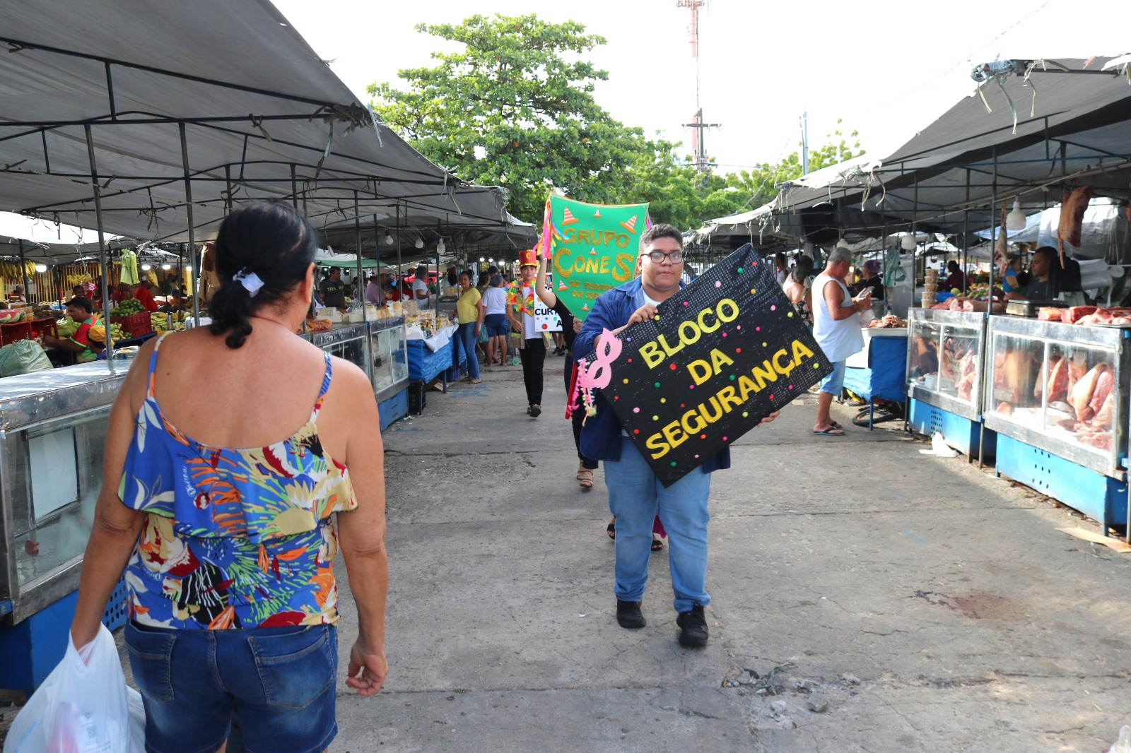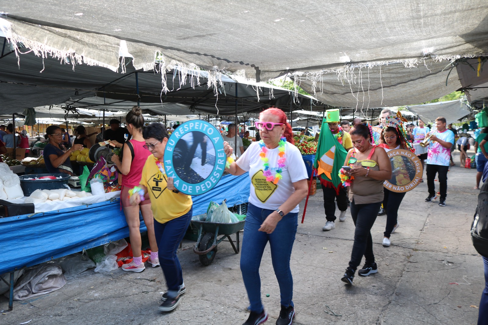 Quem esteve na feira do conjunto Augusto Franco, no bairro Farolândia, na tarde de quarta-feira, 10, testemunhou mais uma ação da Prefeitura de Aracaju voltada para a conscientização no trânsito. Através da Superintendência Municipal de Transportes e Trânsito (SMTT), a gestão municipal levou ao local o Grupo Cones de Teatro, da Coordenadoria de Educação para o Trânsito, com o seu “Bloco da Segurança”. Entre bancas e corredores movimentados, marchinhas carnavalescas e abordagens lúdicas chamaram a atenção de comerciantes, feirantes e frequentadores para a importância de atitudes responsáveis durante o período de festas.